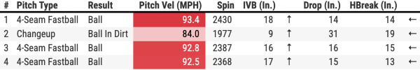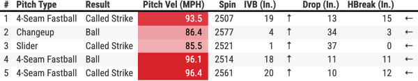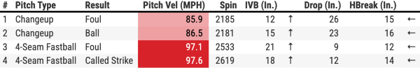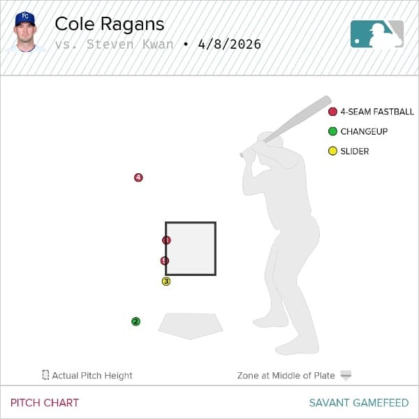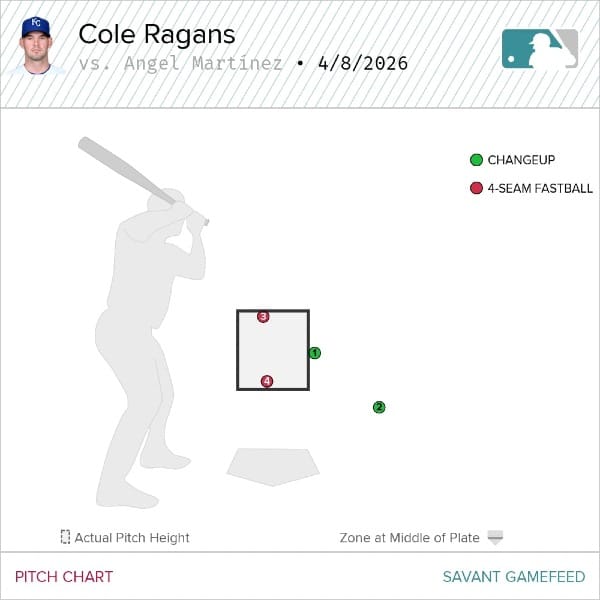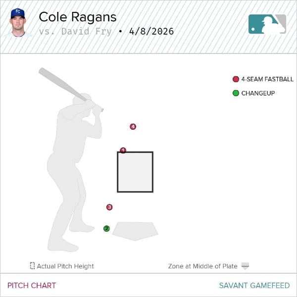 Against the right-handed hitter, Ragans twice went away with the changeup before shifting back to the four-seam. One fastball up, one fastball down and two outs in the inning.