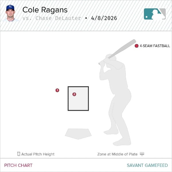 On the Royals.tv broadcast, Ryan Lefebvre was effusive in his praise for the approach of DeLauter. I found myself nodding in agreement. I’m not going to sit here and pretend I know much about hitting a baseball (other than it’s incredibly difficult!), but I think sometimes we get a bit lost thinking about hitters counts and such. What I mean is, in a situation where Ragans is scuffling after getting hit on his pitching hand, DeLauter is betting on getting a grooved pitch. Does it make sense for him to swing away? I think it does, but his zone for that specific pitch has to be extremely narrow. It's basically right where DeLauter would set the ball if it were on a hitting tee. Otherwise, it’s a take. Even if it’s in the true strike zone. In this instance, DeLauter got a fat, middle-middle fastball a couple ticks off Ragans’ maximum velocity. He was looking fastball. He was looking up and middle. The pitch was just a little bit away and DeLauter was a touch behind, but has such a short, compact swing that he was able to barrel and loft it to the left of center.