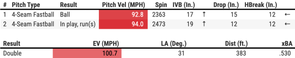 The second pitch was very much a get-me-over fastball. It got over. Not only over the plate, but over the center fielder Lane Thomas and to the wall for a two-out, two-run double.