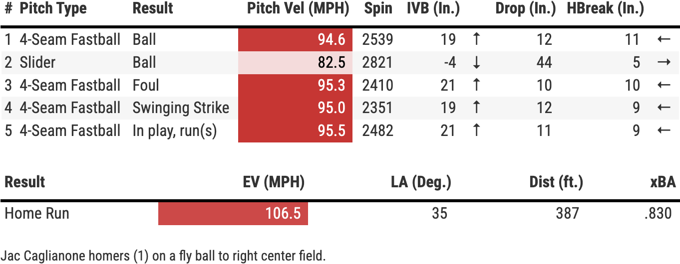 For real…He hit pitch number five over the fence. Pitch number five! Look where that is! For those of you more inclined to be awed by the data, according to Statcast, the pitch was 4.22 feet off the ground when Caglianone made contact. It’s the second-highest pitch hit for a home run this season.