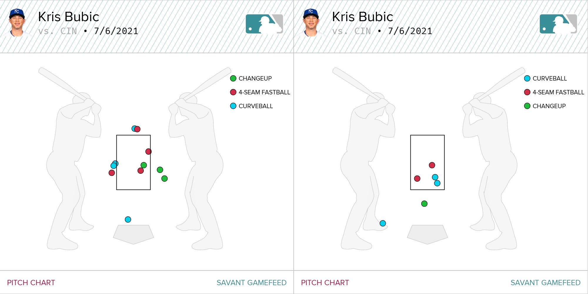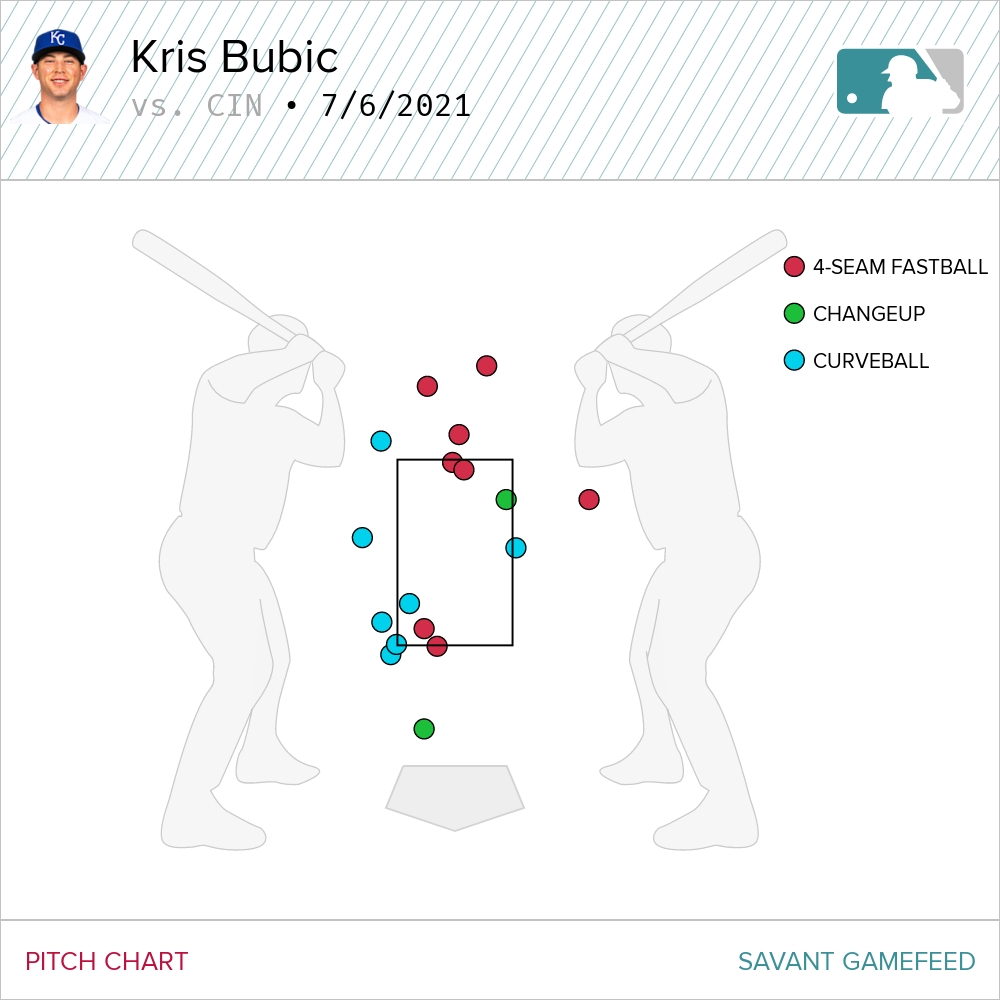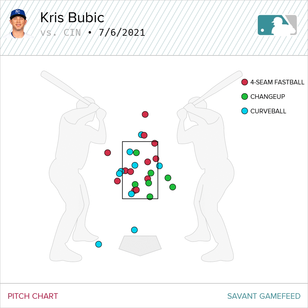 Let’s rewind ourselves to the start of the game, because prior to the offense’s storming comeback, Bubic was the story for the Royals. He opened the game with a wobbly duel against the Cincinnati leadoff hitter Jonathan India where he couldn’t command his fastball at all. It did not portend success as without that four-seam command, his secondary pitches weren’t going to be effective at all.