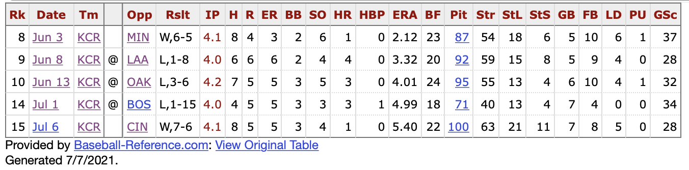 While there were definitely some positives in how Bubic performed, the negatives once again overshadowed his outing. It was his fourth straight start where he allowed five runs or more in fewer than five innings. His average Game Score over this span is an extremely underwhelming 32.