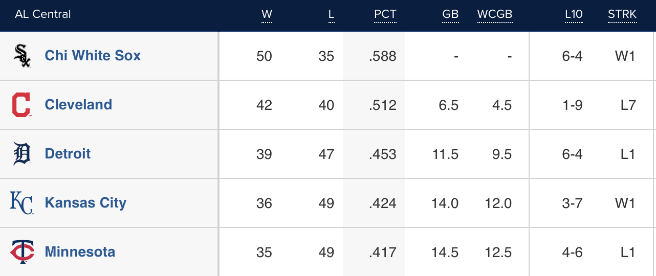 It appears the teams in the division have settled into their spots for the moment. The key battle would appear to be the dogfight for fourth between the Royals and the Twins. As we’ve just edged past the halfway point of the season, I would still feel comfortable wagering on the Tigers to eventually find their way to the basement.
