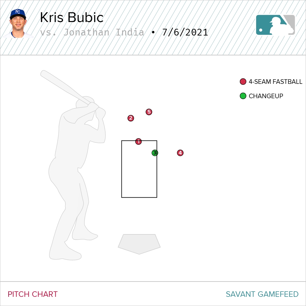 India didn’t offer at any of the five pitches he saw because he simply didn’t need to do any work. Bubic put him on base with a free pass.