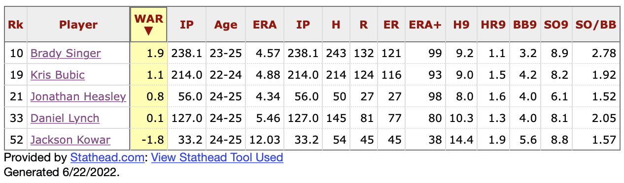 The Royals can’t get this wrong. They have to have this crop of young starting pitchers to place not just one in the top 10 in bWAR. They need at least two and they need them to rank well up the list. That’s not happening so far. And if we’re setting a marker down today, that’s a failure.