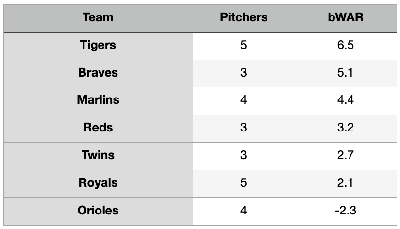 Powered by Mize and Tarik Skubal, the Tigers are easily setting the pace with their young arms. The Braves have collected most of their bWAR on the arm of Ian Anderson. Trevor Rogers is setting the pace in Miami, but is helped by Sixto Sánchez and his 1.5 bWAR. Bailey Ober and Joe Ryan have 3.0 bWAR between them in Minnesota.