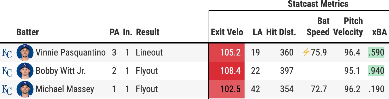 Michael Massey went after the first pitch from Cole. The good old fashioned Esky Ambush. With that short porch in right, I thought for a moment it had a chance. (More on that damned short porch in a moment.) Bobby Witt Jr. smoked one to center that I thought for certain was a triple. Somehow Aaron Judge tracked it down for the second out of the inning. As you can see above, Witt’s ball had a .940 xBA. Rotten luck. Then it was good to see Vinnie Pasquantino smoke a ball at 105 MPH off the bat. I think we can put that broken thumb behind us for the rest of October.