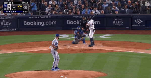 Wouldn’t you know that the Royals get into a spot of hot water in the bottom of the inning when, after a leadoff walk to Gleyber Torres, a knock from Juan Soto at 72 MPH falls in down the left field line for a double. That put starter Michael Wacha immediately in the jackpot—runners on first and second with no outs. A strikeout of Aaron Judge on a patented filthy Wacha change got the crucial first out.