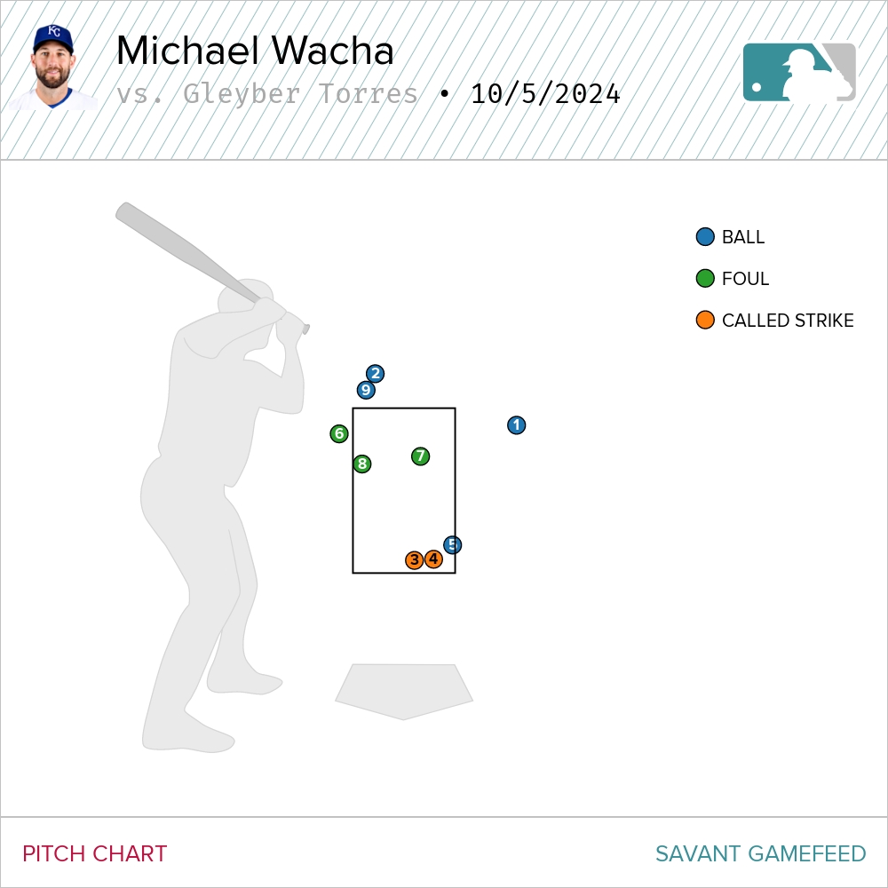 The next batter, Austin Wells, hit a grounder to a drawn-in Yuli Gurriel who fired home for Salvador Perez to slap the tag on Torres for the second out. Then, this beauty of a sequence from Wacha to Giancarlo Stanton.