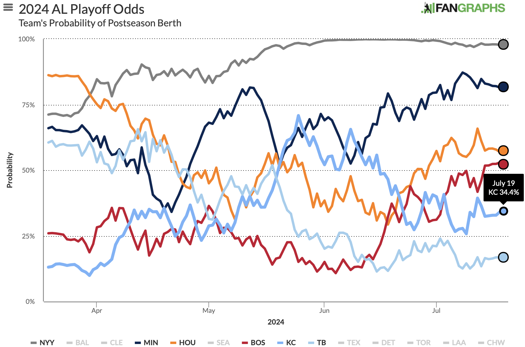 The above are the odds to make the playoffs. That’s either through the division championship or the Wild Card. I customized the graph to include only teams currently in the mix for the Wild Card. The Royals’ odds (according to FanGraphs) is hovering around 35 percent. It’s not great, but given where the Royals finished last season and the expectations going into 2024, wouldn’t you take those odds at this point?