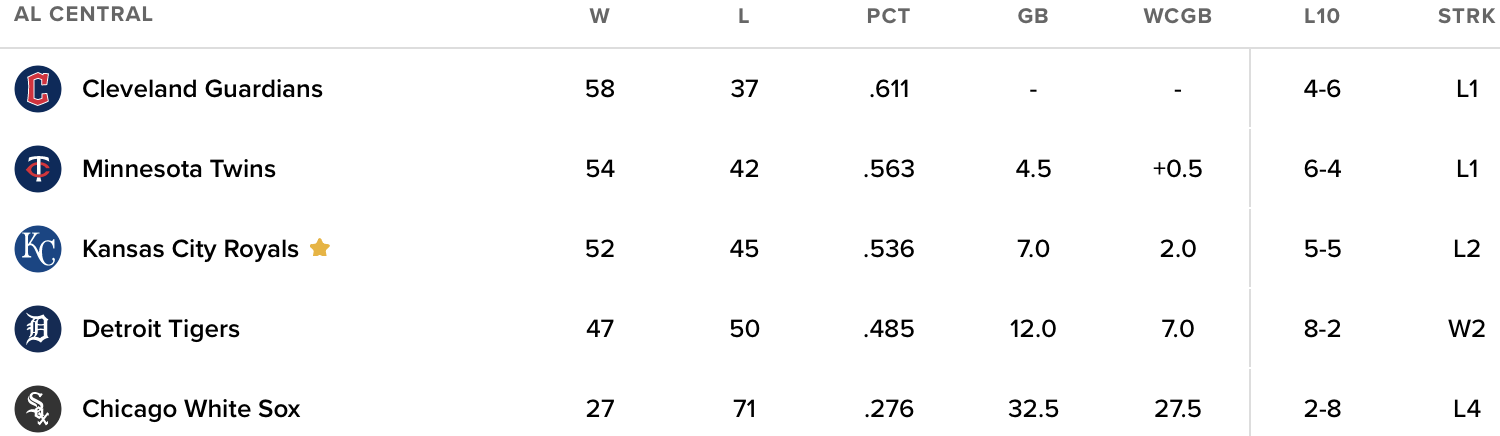 Let’s take stock of where things stand as the season’s defacto second half gets underway on Friday. The Royals are hanging tough in the AL Central, currently in third place, seven games back from the Cleveland Guardians.