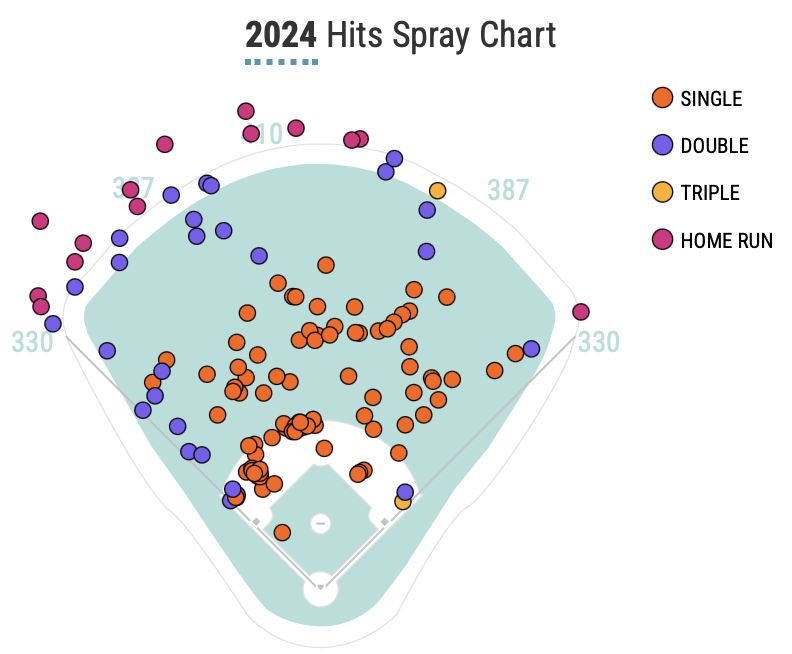 The knock on India is his contact. The guy just doesn’t square up the ball like you want from a hitter at the top of your order. His average exit velocity of 87.2 MPH ranked 113 out of 129 qualified hitters in 2024. Statcast had his Hard-Hit Rate (balls hit with an exit velocity greater than 95 MPH) at 36.5 percent, which placed him in the 28th percentile. For a guy who is so good at recognizing a good pitch in the zone and making contact, you are left wishing that contact could be a little better.