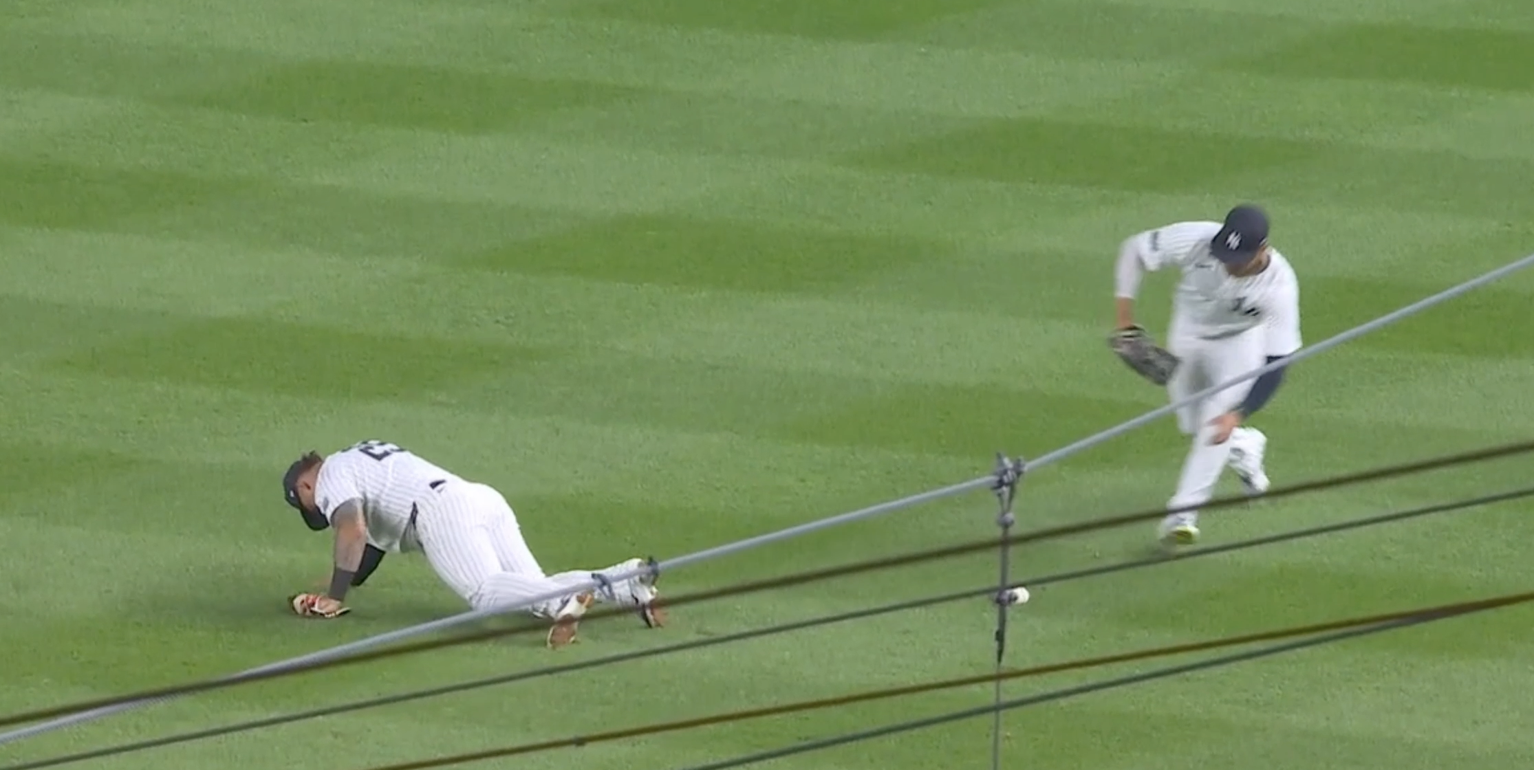 Juan Soto comes in from right and Gelyber Torres moves out from his position at second. It will be Torres’ ball, except he overruns it and gets rather contorted trying to recover. He completely misses the baseball.