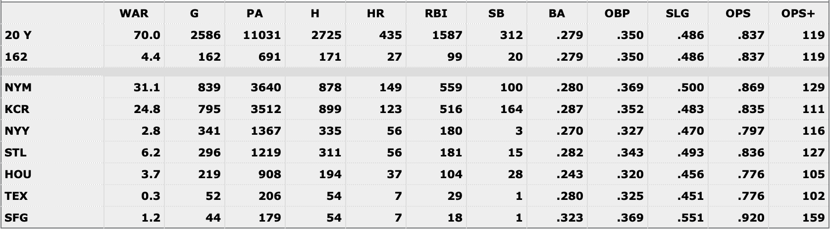 Beltrán played for seven different teams over his 20 year career. He made most of his appearances with the Mets, with the Royals a close second.
