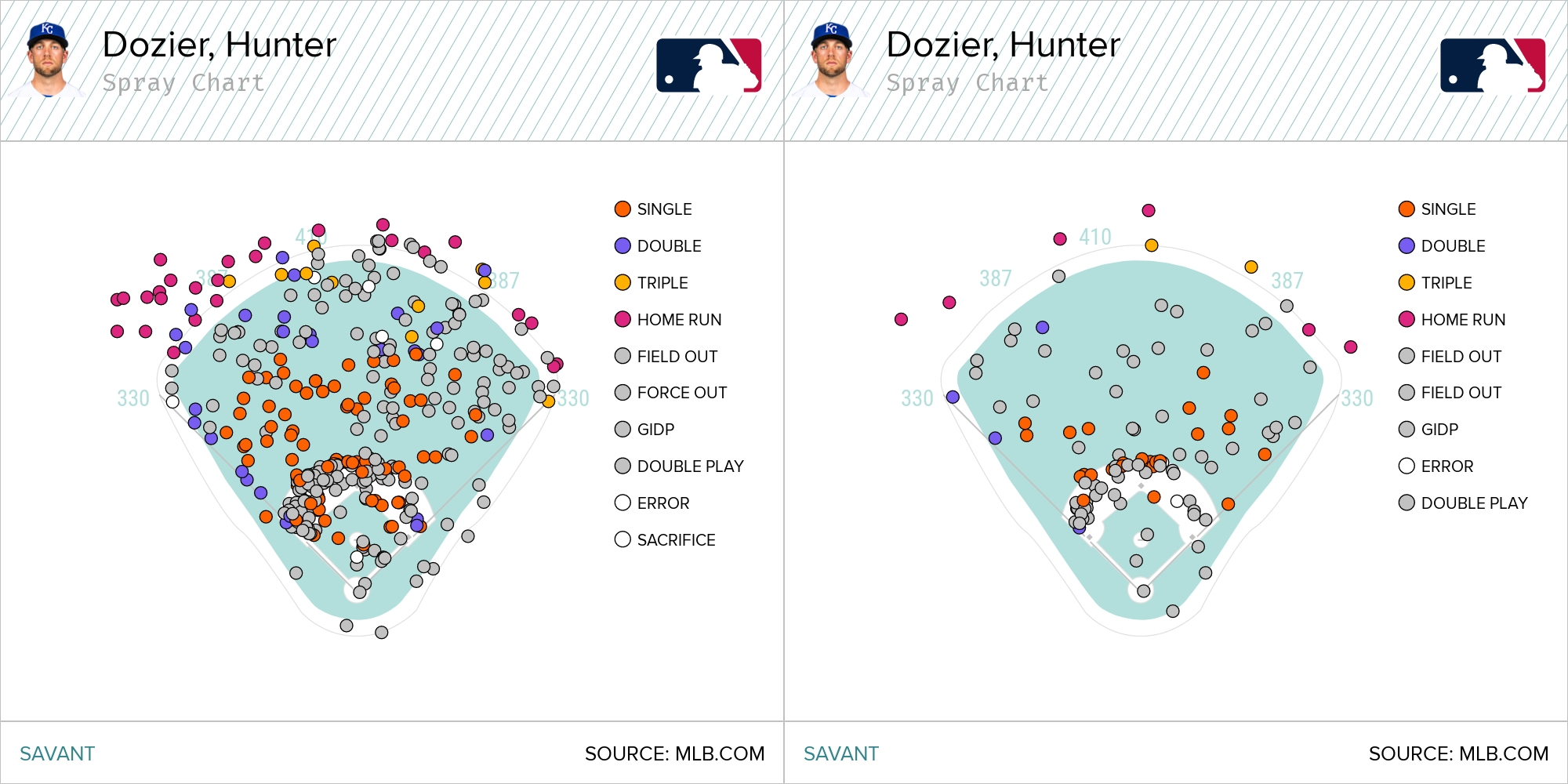 What I really like about the spray charts from 2019 and 2020 is the opposite field power. Dozier’s double’s production inexplicably fell off last year but his home run output was fairly close to the pace he established in 2019 and the placement of the home runs was kind of evenly distributed to all fields.