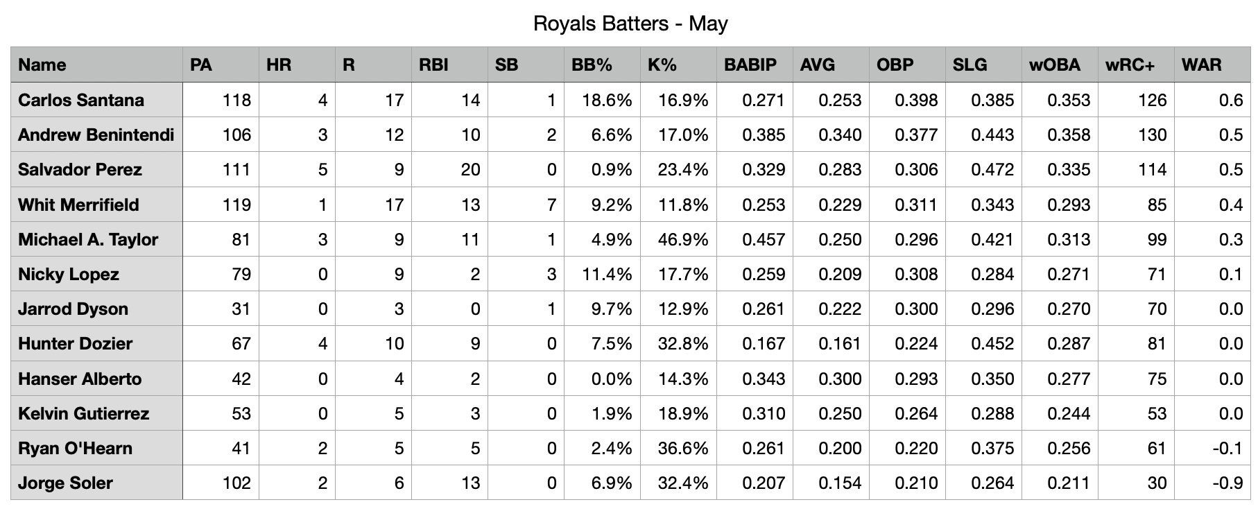 He was second on the team in home runs, tied for first in runs scored and of course he led the way with 22 walks against just 20 strikeouts. Because he’s a Royal, he added a few productive outs for good measure—a team-high three sacrifice flies.