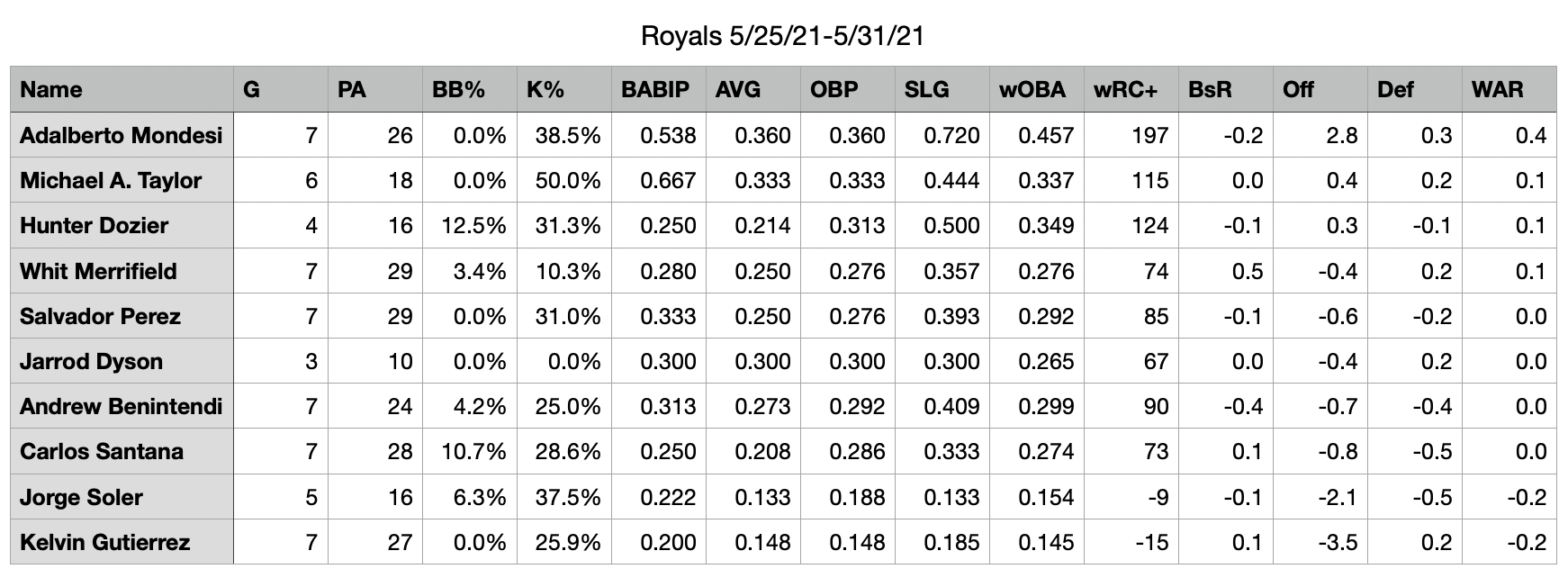 I’m loathe to put WAR on a chart that has just a week’s worth of games, but it does serve to underscore just how valuable a healthy Mondesi is to this team. He can literally do everything on the field. The issue has been actually staying on the field for any length of time and once on the field, firing on all cylinders for an extended period. We caught a glimpse of what could be in the second month of games in 2020. We got a tantalizing look in the last week of May in 2021. Hopefully, the tests come back okay and Mondesi can get back to action immediately.