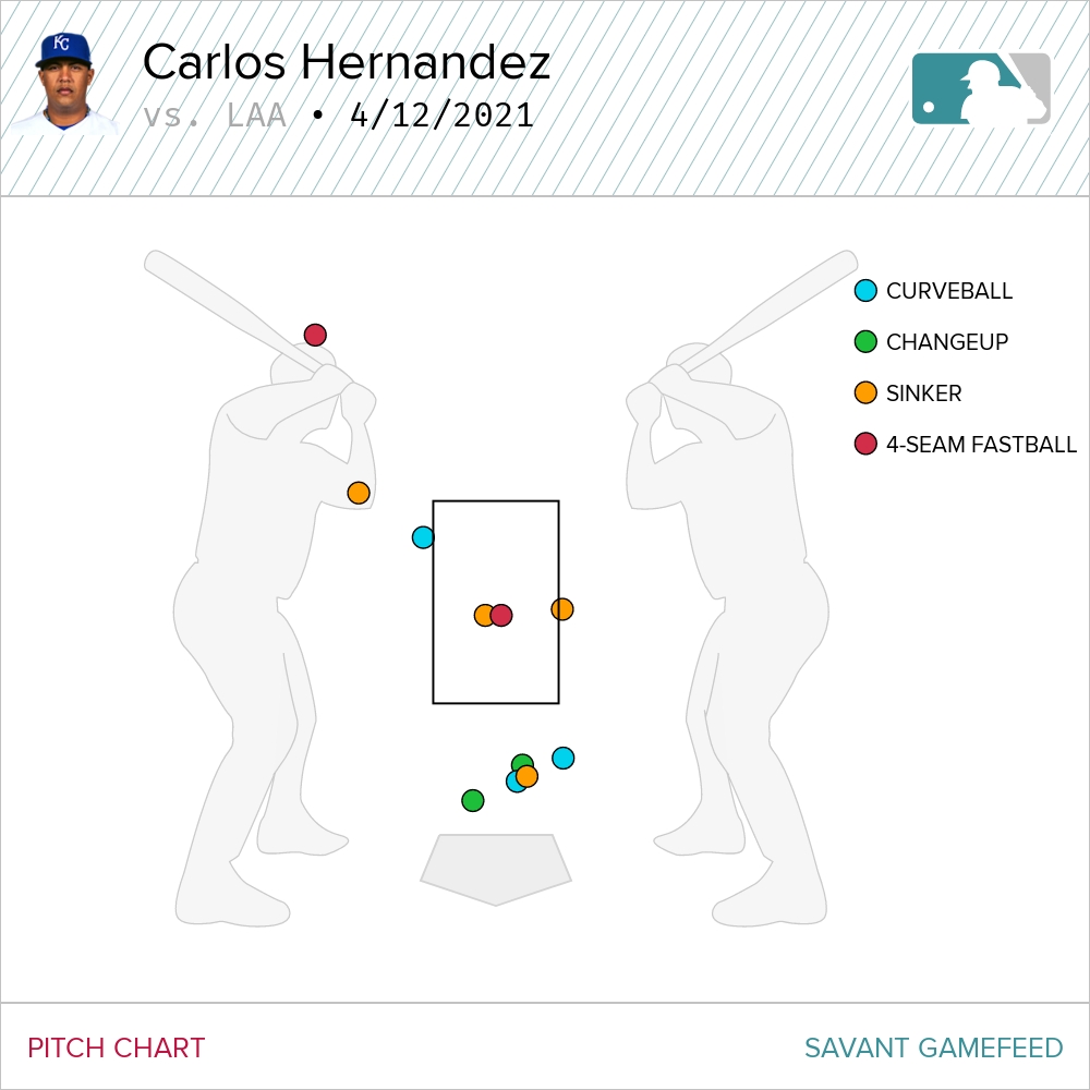 Brady Singer took the ball for his second start of 2021 and pitched relatively well, dancing around difficultly in three of his five innings. He stuck almost entirely with the sinker/slider combo, turning to his change for only two pitches according to tracking data from Baseball Savant.