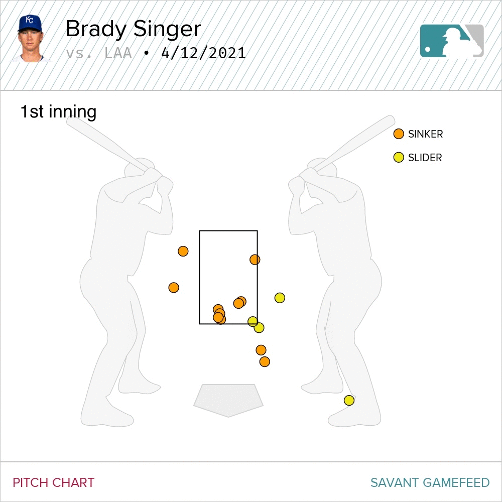The issue with Singer’s start was more about his locating of the sinker. It sounds counterintuitive, but when pairing it with the effective slider, he should be using it up in the zone a little more. Especially if he’s going to be throwing it around 95 mph, which he did on Monday. He didn’t start climbing the ladder with the pitch until the later innings of his outing.