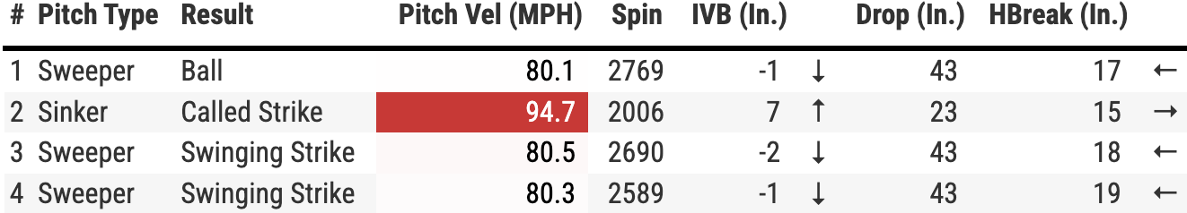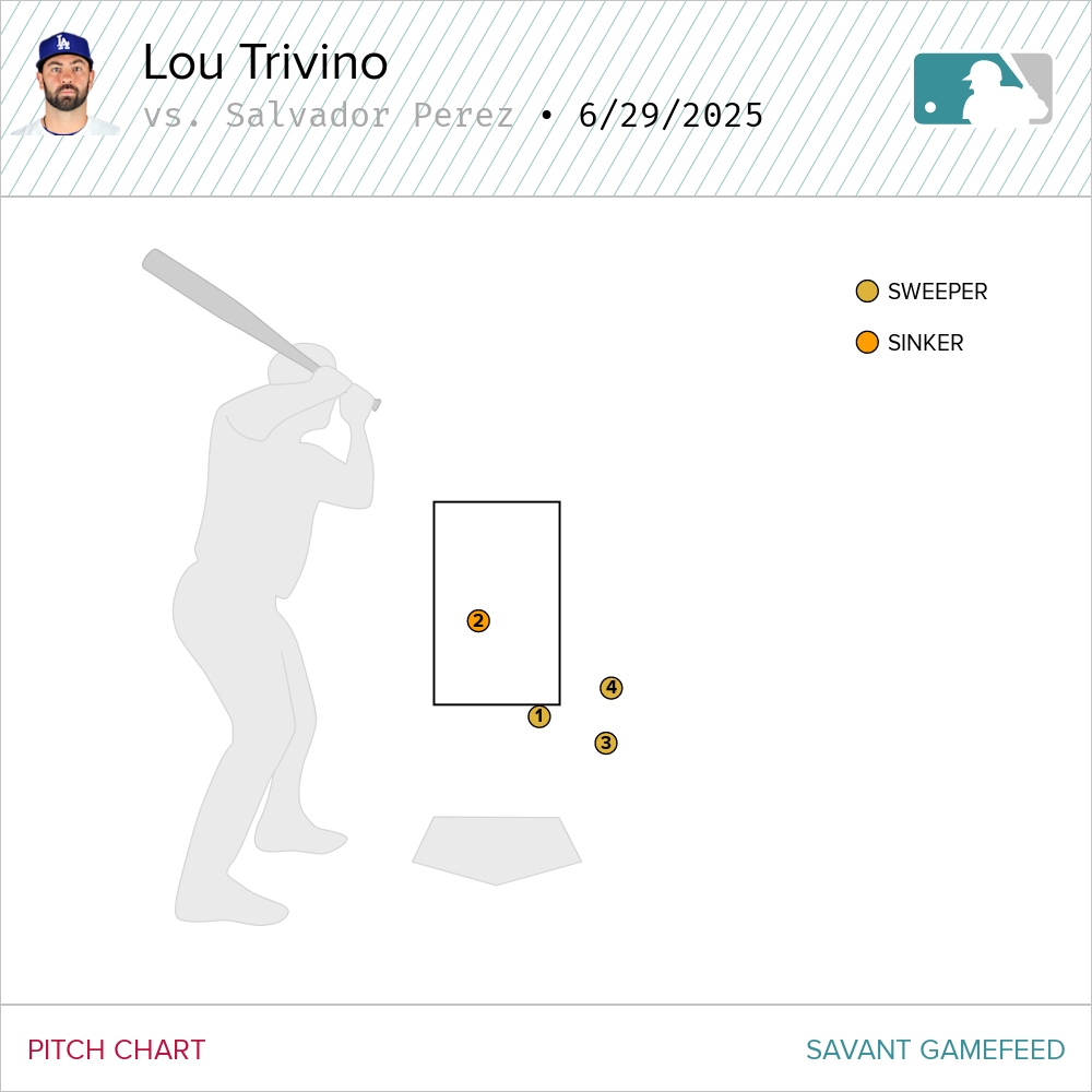 With two outs, it was up to Salvador Perez to pad the early lead. He took a sweeper down for a ball and then watched a good-looking sinker for a called strike. With the count 1-1, he then proceeded to chase back-to-back sweepers that were well off the plate.