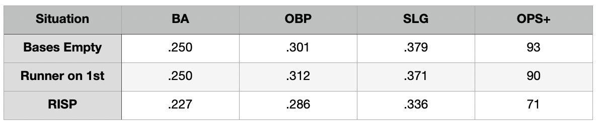 When they get ahead in the count, they’re terrible. Overall, the team is hitting .242/.343/.374 when they jump ahead 1-0. Yes, those numbers are better than when they fall behind 0-1, which they should be. But the split of when this team gets ahead 1-0 has them at an abysmal 79 OPS+, worse than every team in the majors, save the Chicago White Sox.