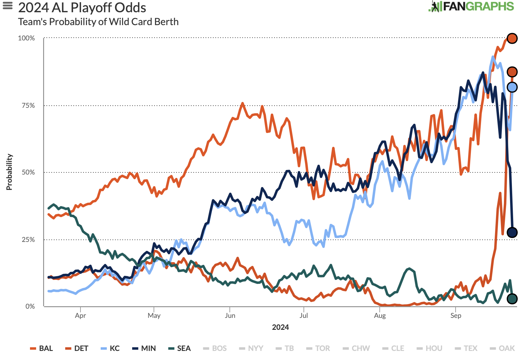 The win was worth around 15 percentage points for the Royals according to FanGraphs playoff odds. The Twins’ loss saw their chances almost cut in half—in half!—from 52 percent to 28 percent. Yes, Tuesday was seismic.