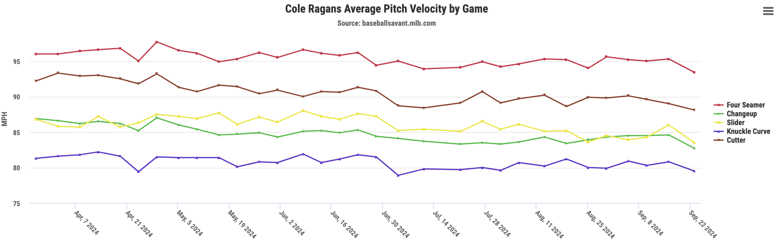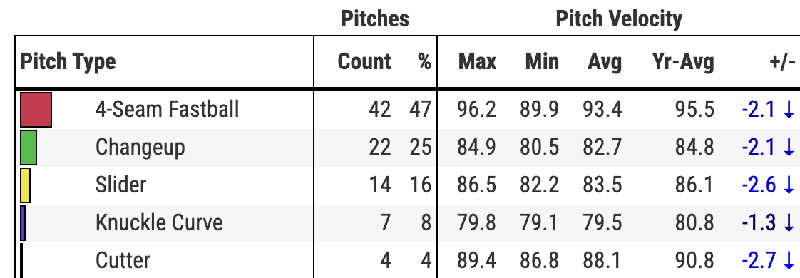 At this point in the season, there are so many data points (starts) that it can be difficult to read. I think you can see the dip in velocity from his start against the Tigers last week and Tuesday’s. He’s had similar drops from start to start, but that was the slowest he’s been all year.