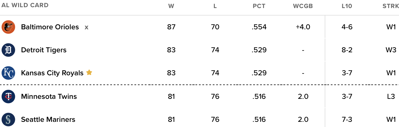 There are five games to play and I’m frankly exhausted by all the permutations and calculations that go into this. It wasn’t supposed to be this difficult. Again, the Royals are really in second in these standings, as they’re the owners of the tie-breaker over the Tigers. The Twins and Mariners are lurking but are running out of time. This is a very attractive situation for the Royals.