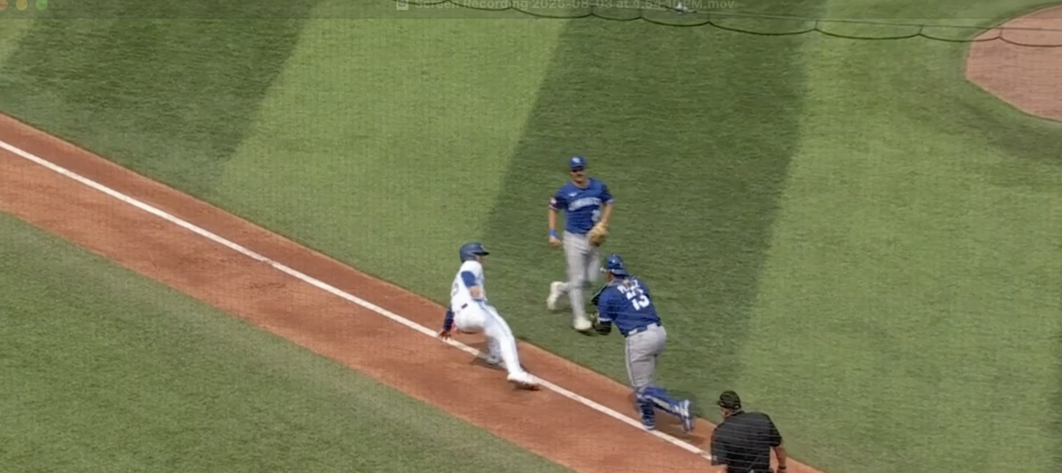 Because Frazier ran with the ball, the Jays now have two runners in no man’s land between two different bases. As Varsho moves further down the line, Frazier decides to take no chances and focus on the lead runner. He peels off toward home.