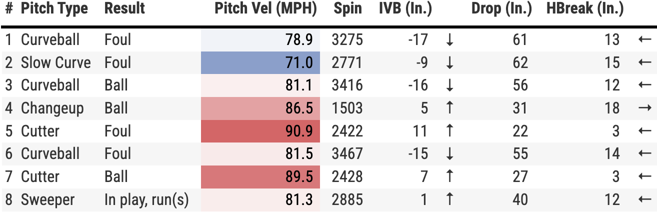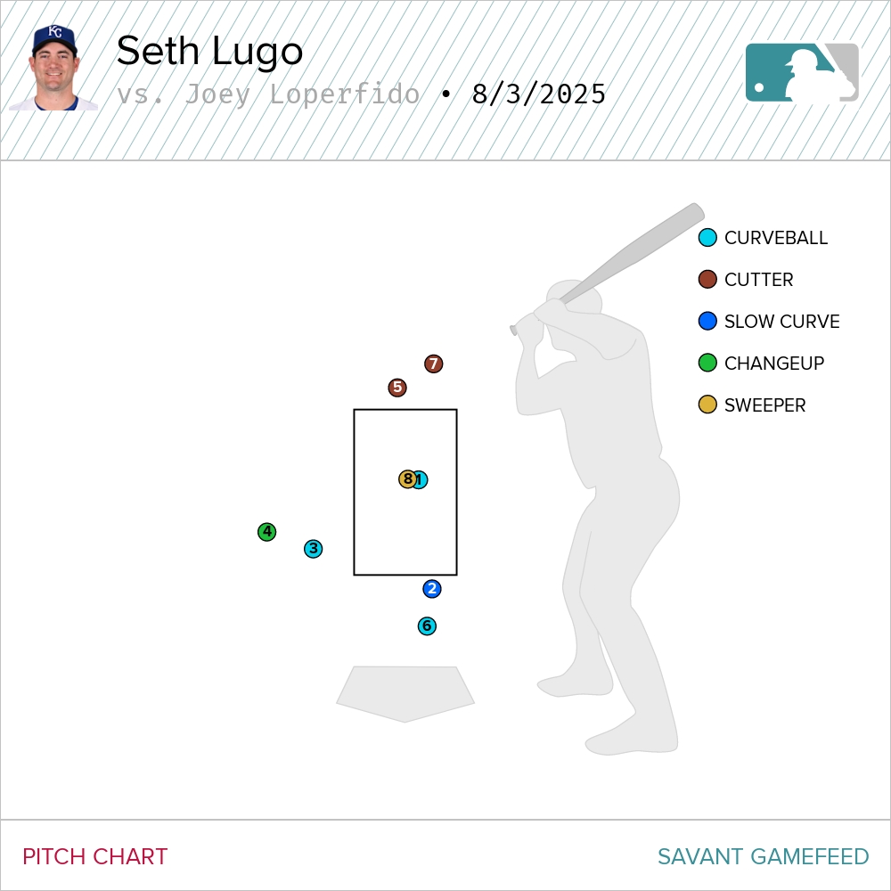 It’s kind of amazing that Loperfido didn’t walk. He fell behind 0-2 on a couple of curves, laid off the next two pitches that were well off the plate, and then went into protect mode on a high cutter and a low curve to stay alive. He passed on another cutter and then found a middle-middle sweeper he was able to rip. With one swing, Loperfido knocked the ball to center and knocked Lugo out of the game.