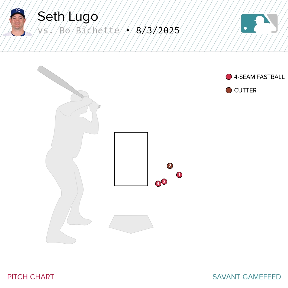 Lugo, like most pitchers, works up in the zone with the four-seamer. Against Bichette in their first confrontation of the day, Lugo was clearly trying to keep the fastball down. Maybe this was part of the game plan against Bichette. He’s hitting just .231 against low four-seamers this season with a whiff on over a quarter of all swings. He has yet to barrel a low, four-seam fastball this year.