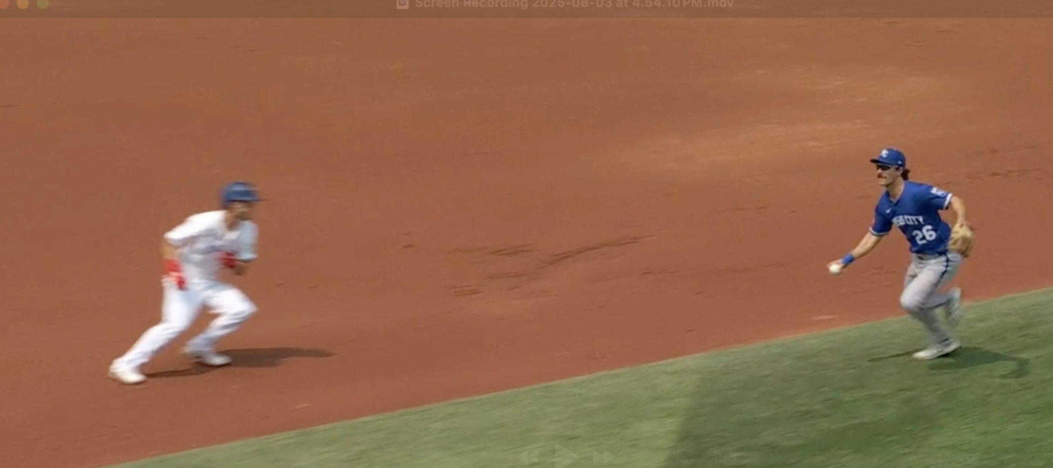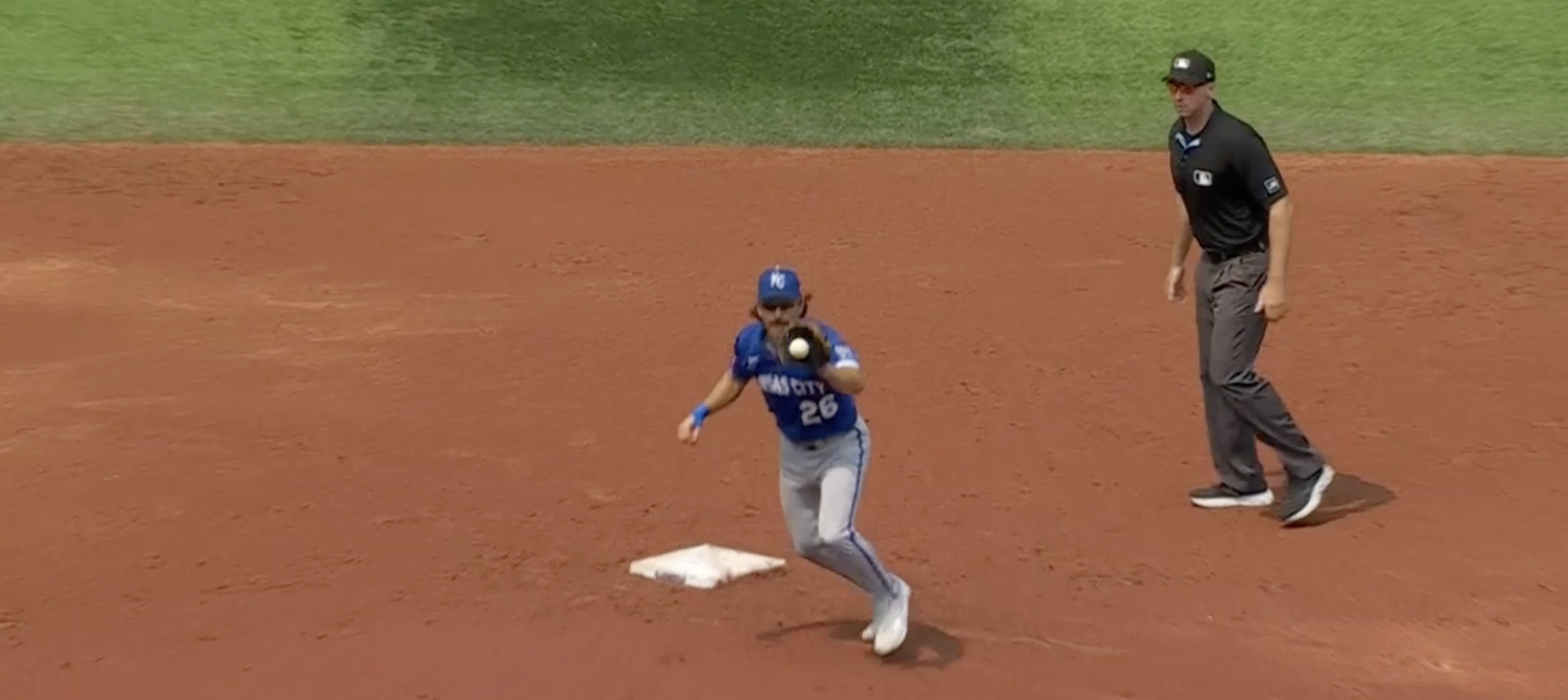 From there…chaos. Varsho, who is generally a good baserunner, slammed on the brakes at third. That caused Clement to get hung up in a bit of a no man’s land between second and third. Salvador Perez fielded the throw from Rave and shot a laser to second, behind Clement. Better to just let the visuals take this one.