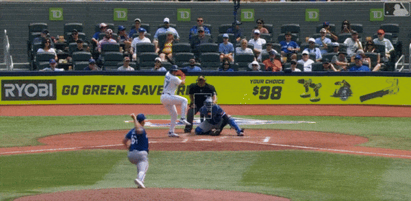 With Randal Grichuk on second as the Royals Manfred Man, Kyle Isbel was the first man up. Who here thought he was going to bunt? I certainly did. The Blue Jays did too, playing short at the corners. Isbel had different thoughts. He yanked a first pitch fastball on the inner half down the first base line for an easy run-scoring double. One pitch and the Royals had their first lead of the afternoon. Thank you very much, Mr. Commissioner.