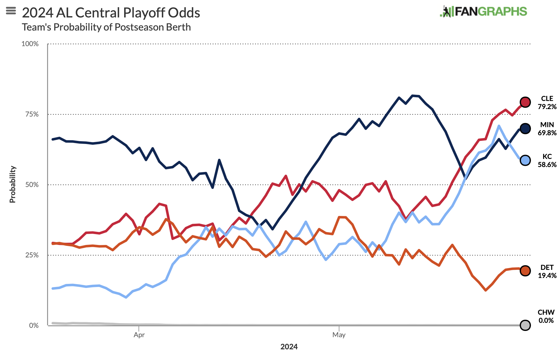 There’s quite a bit of volatility in the playoff odds at FanGraphs. Losing back-to-back games to the team immediately behind you in the standings—a team that was initially favored to win the division—will do that apparently.