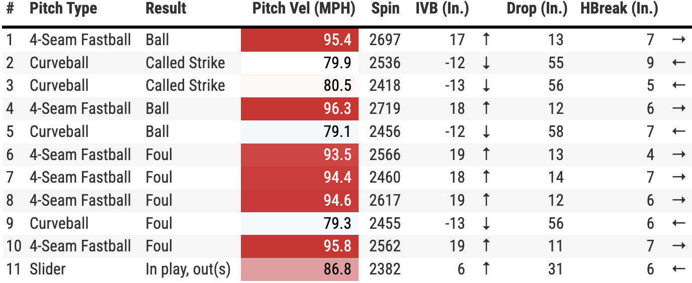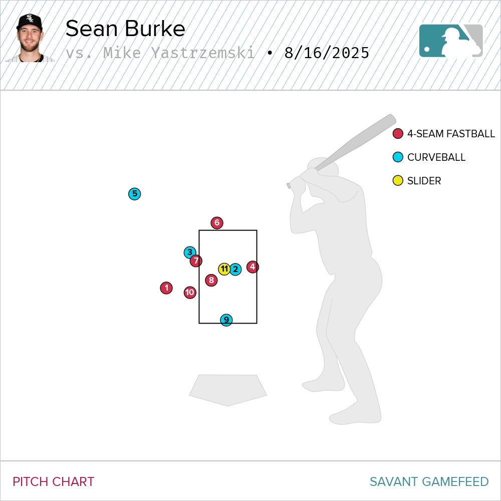 It would appear that Burke also has a difficult relationship with throwing a strike to a base. The bottom four-seamer in the chart above was a 3-2 pitch to Kyle Isbel that he chopped back to the mound in the second inning with runners on first and second and one out. A tailor-made double play ball if there ever was. Except Burke airmailed his throw to center. That error allowed the second run of the game to come across for the Royals.