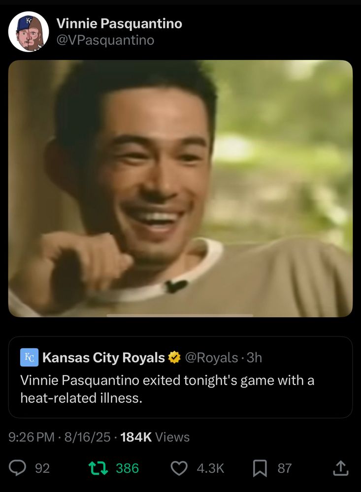 The good news: The Royals announced within an inning that Pasquantion was out of the game due to a “heat-related illness.” That completely checks out. He appeared to be fine after the game.
