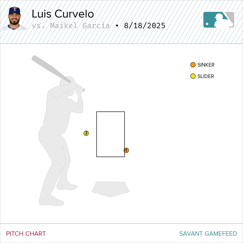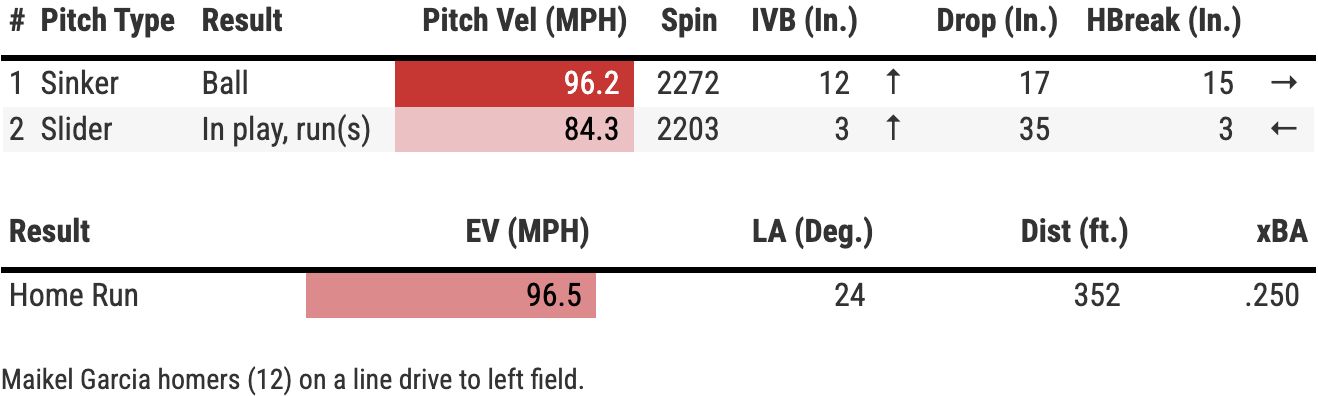 What??? If I had told you Maikel Garcia hit a home run in the game and presented you with the plot above, you would probably ask where the third pitch was. Because he’s not doing damage to either of the two above. At least, he shouldn’t be.