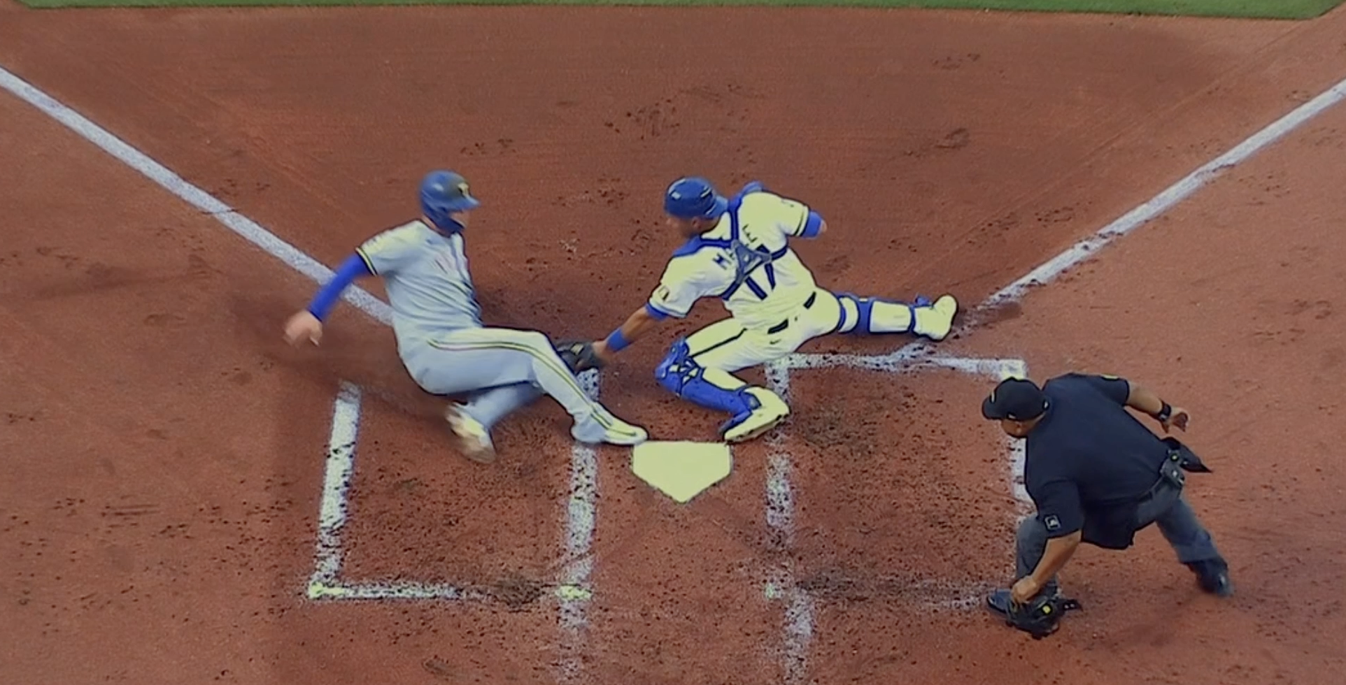 It was also a great pick at home by Luke Maile, who applied the tag. But did Pederson beat the throw? It was close. Very close. The Rangers challenged. I thought this was the definitive frame on the myriad replays we saw.