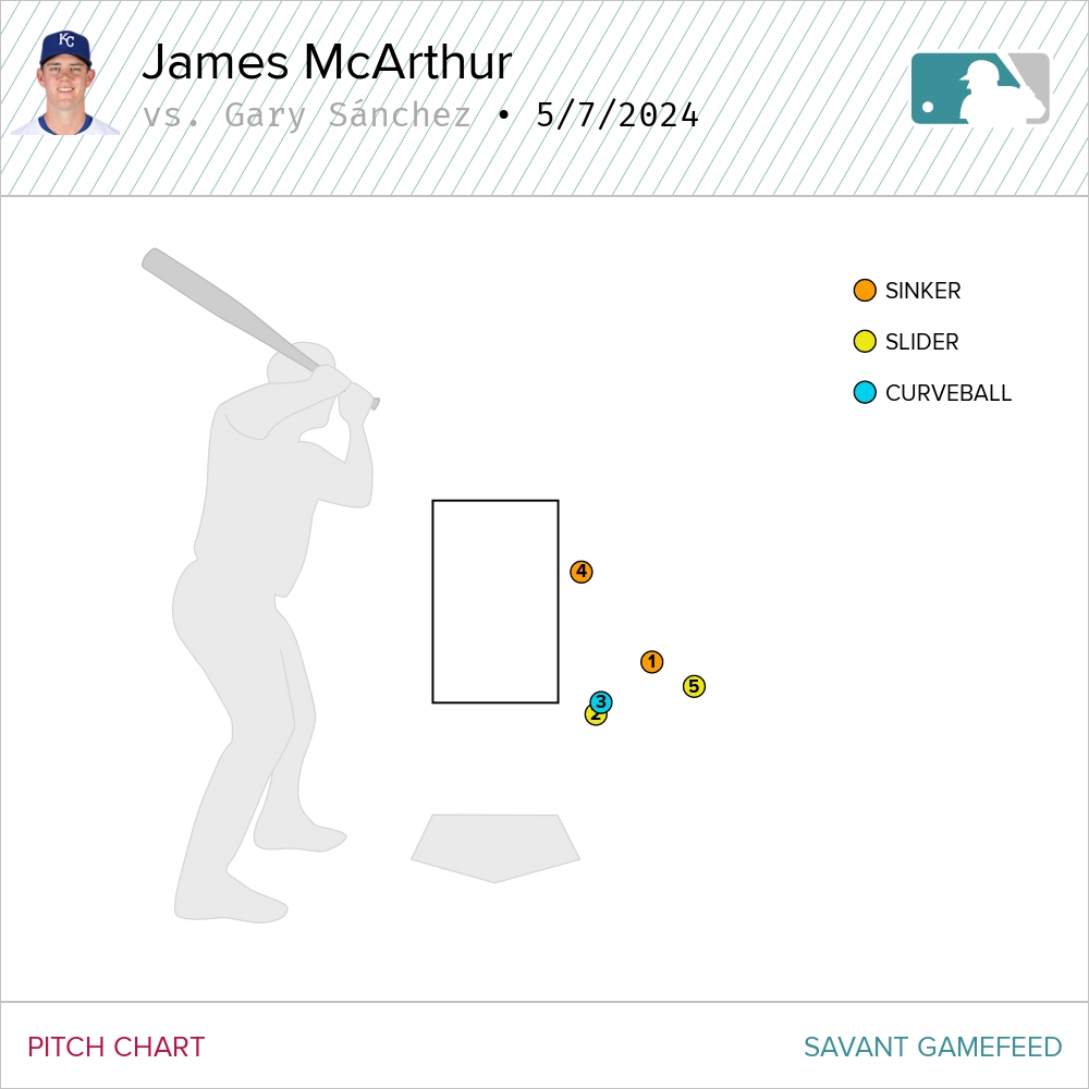 The fourth pitch, the sinker up, was one of those automatic 3-0 strikes. McArthur was working away, away, away, looking to get Sánchez to fish for something, but ultimately they were going to be ok putting him on first with the base open. Still, just needing one out and with Sánchez the tying run, why not pitch to him? He’s a guy with a career .309 OBP and is sporting a .281 mark on the season so far. Yes, he’s hit four home runs in 52 at bats, but still…I really would’ve liked McArthur’s chances against him in that situation. Now you have the lead run at the plate, plus Adames is a much better hitter.