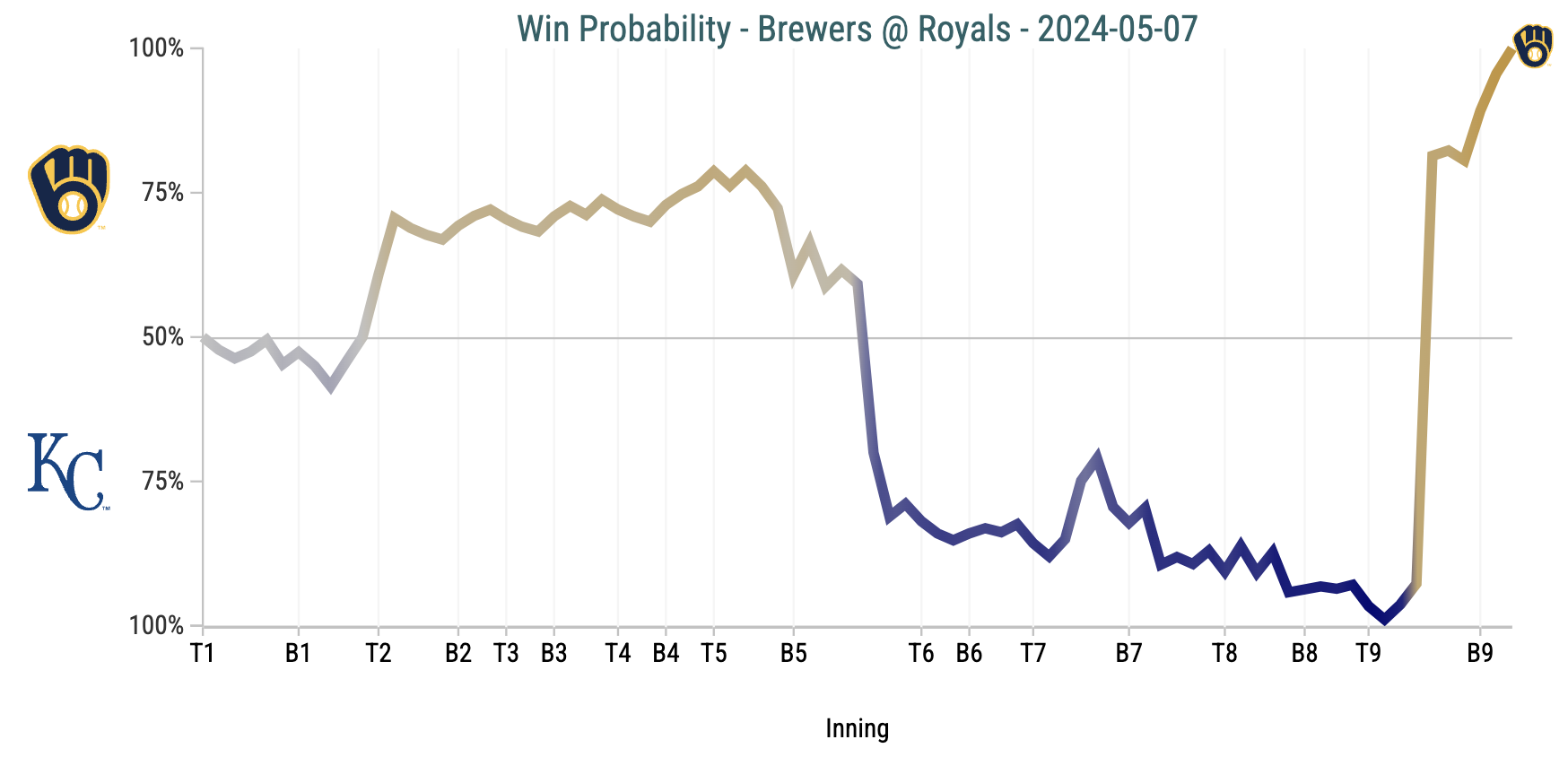Closer James McArthur had the Brewers on the ropes. He retired the first two batters he faced. You can see the moment on the graph above. It’s that instant in the top of the ninth where the Royals held a Win Probability of 99 percent. Normally, you like those kinds of odds. On Tuesday, it didn’t matter.