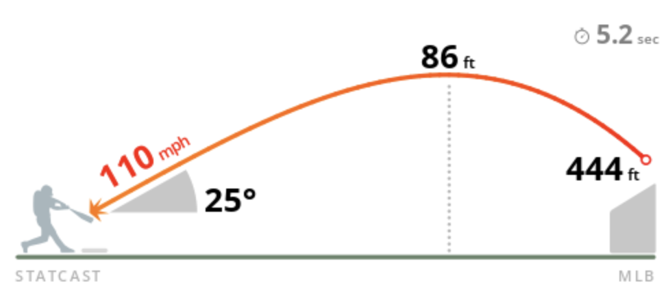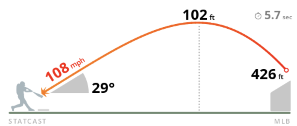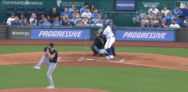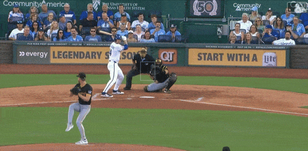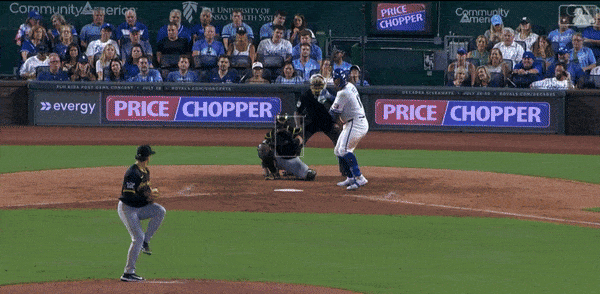 That baseball left his bat at 110 mph and travelled 444 feet. It bounced off the top of the Sonic sign just to the left of the batter’s eye and ricocheted into the upper tier of the fountain. That part of the fountain is original to the stadium. You don’t see on land there often, on a bounce or otherwise. (Witt’s home run I listed above did.)
