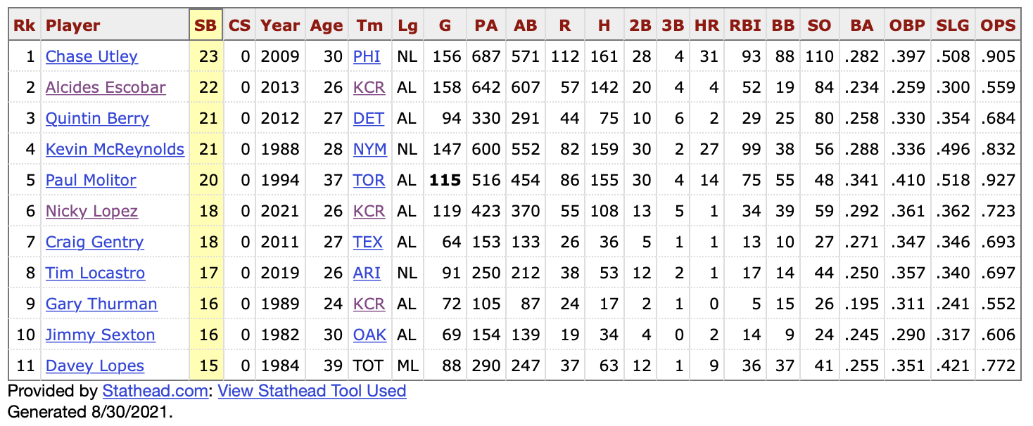 According to data at Stathead, Lopez is five stolen bases from tying Chase Utley for the most steals in a single season without being nabbed. Kind of wild that of the 11 names on this list, three are Royals. What was that I was saying about stolen bases being part of the organizational DNA..