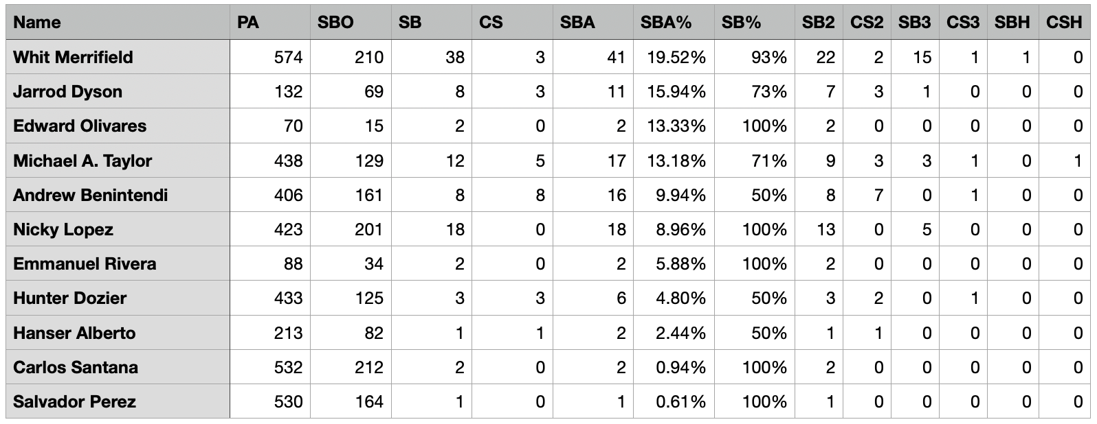 But the Royals certainly aren’t slouches when it comes to swiping a bag. Naturally, not everyone is running. Let’s look at those who are stone cold base stealers.