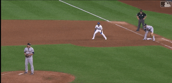 Merrifield is an expert at employing that hop toward third, gaining momentum while the pitcher is still holding the ball. If the shortstop makes a break to the bag and alerts the pitcher as soon as Merrifield makes that move, he’s toast. It’s a low-risk situation however, requiring both the shortstop and pitcher are in sync that rarely happens when holding a runner on second.
