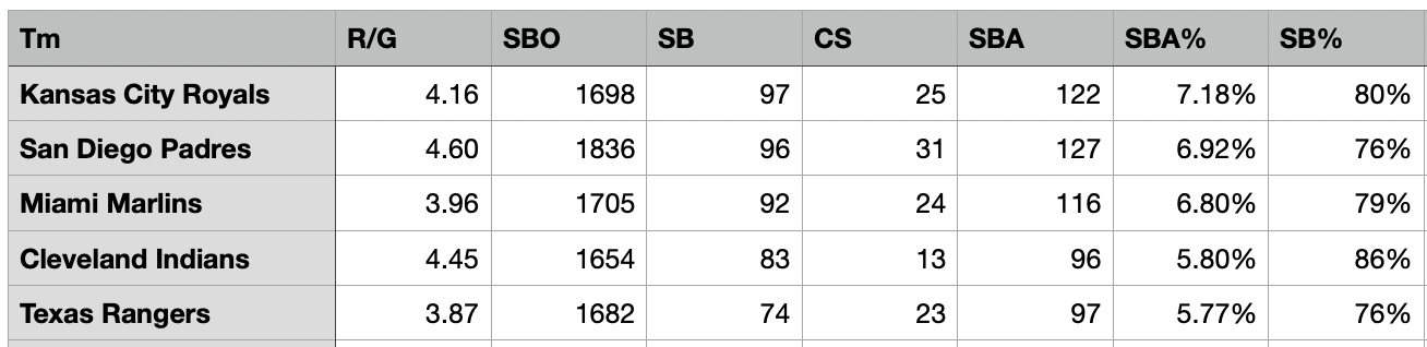 The San Diego Padres sprinted out of the blocks this year; they’ve been the top thieving team for most of the year. While their playoff chances have dimmed in the season’s second half, they’ve become a bit more conservative on the bases, allowing the Royals to catch them. Kansas City is now running over seven percent of the time when the next base is open. There’s a huge gulf between the top three teams, and Cleveland at number four. They impress because their success rate of 86 percent is the best in the majors this year. They’ve found the perfect intersection of opportunity and success.