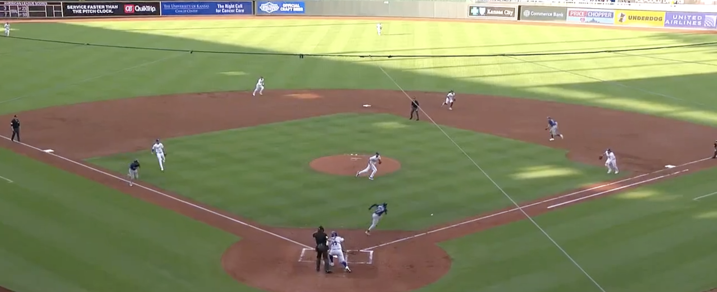 Meanwhile, Tampa embarked upon a moment where they decided to inflict death on the Royals by a thousand paper cuts. In the second inning, back-to-back singles had runners at the corners with one out. José Caballero laid down a bunt along the first base line. A safety squeeze and, with Jonathan India slow to get to the bag at first, the Royals were not able to record an out.