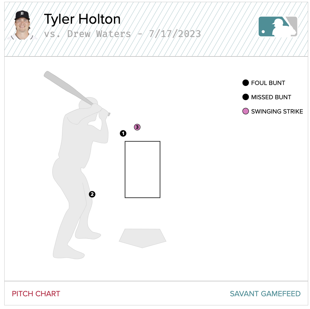I badly wanted to gif the first two pitches of this at bat. Badly. The videos aren’t live yet, so you’ll just have to trust me when I write that Waters had no business trying to get the first pitch down, a cut fastball running up and in. It looked like Waters had never been asked to lay down a bunt in his life. Someone who was comfortable bunting would’ve pulled the bat back. Someone uncomfortable (i.e. Waters) would decide they were going to push at the pitch no matter the location. That’s exactly how that first pitch vibed.