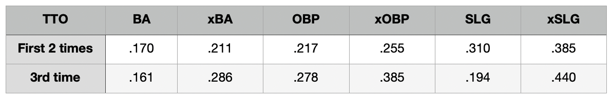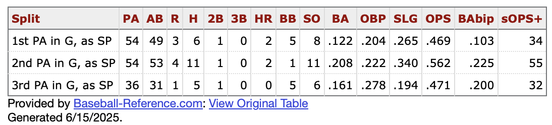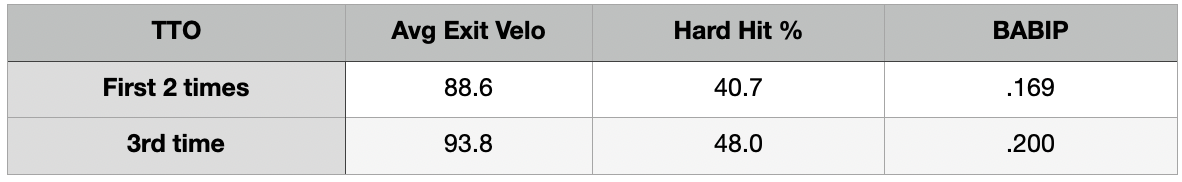 The Statcast data backs that up. Seeing him a third time, opposing hitters start to punish Cameron. He’s dodged trouble to this point, but I don’t see this as something that’s sustainable.