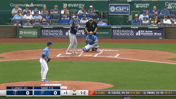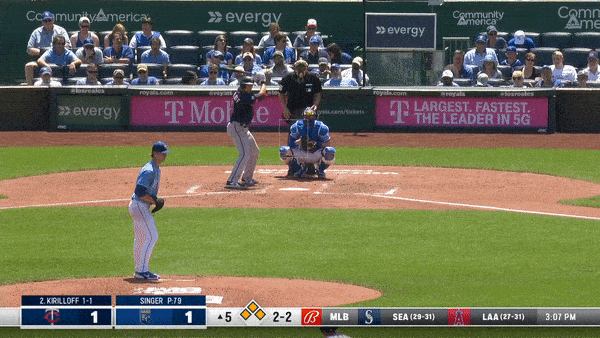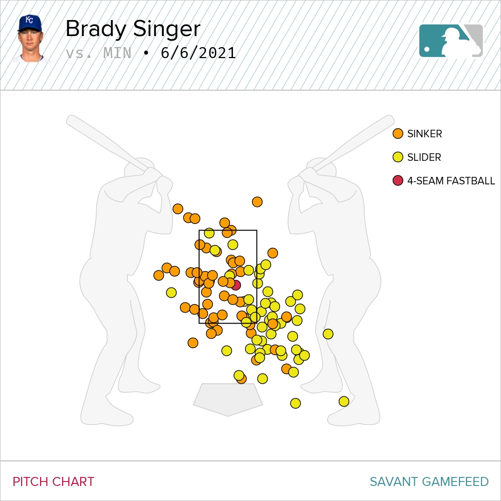 The one thing Singer did not do on Sunday, was offer his changeup. It’s not like it was a glaring omission—he’s only thrown it 4.5 percent of the time this year, and never to right-handed batters. But it would behoove Singer to figure out a way to incorporate that third pitch into his arsenal. He split his pitches almost evenly on Sunday, throwing 54 sinkers and 51 sliders. The slider was especially effective for him, with a bump in velocity and an increase in spin rate over his averages in 2021. Twins batters weren’t able to establish hard contact regularly against the pitch, averaging an exit velocity of just over 75 mph on the slider. He generally located the pitch well.
