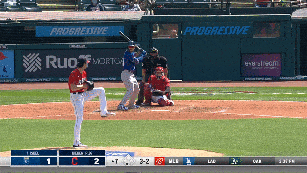Bieber started the rookie off with a knuckle-curve just off the lower part of the strike zone that Isbel offered at and missed. The next pitch was a fastball that dotted the outer half of the zone for strike two.